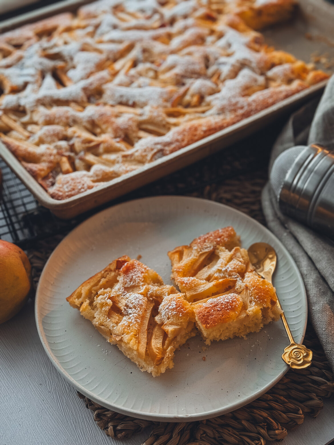 - Diese Masse dann auf den gut gefettetem großen Ofenzauberer mit Rand geben und glatt streichen. Die Äpfel entkernen und mit der Mandoline auf Funktion Stifte / Stufe 8 zerkleinern und auf dem Teig verteilen.
