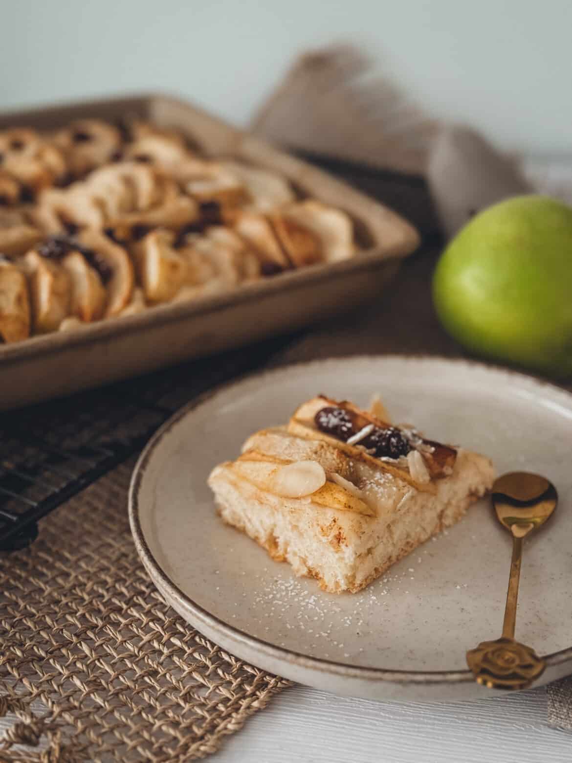 - Teig dicht mit den Apfelspalten belegen. Mandeln und Rosinen darauf streuen. Kuchen ca. 35-40 Min. auf dem Rost, unterste Schiene backen. Am besten lauwarm mit Sahne servieren.
