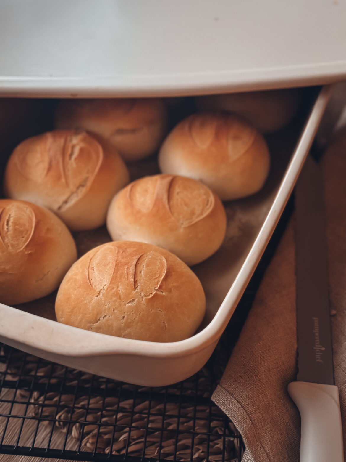 - Das Grundset in den kalten Backofen stellen. Die Temperatur auf 230°C Ober- und Unterhitze stellen. Die Brötchen 30 Minuten backen.