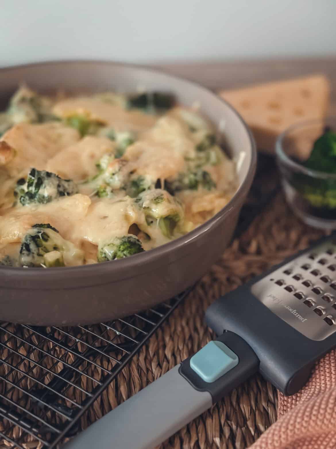 - Die Sauce über die Kartoffeln und den Brokkoli geben. Mit der groben Reibe den Käse über dem Auflauf verteilen.