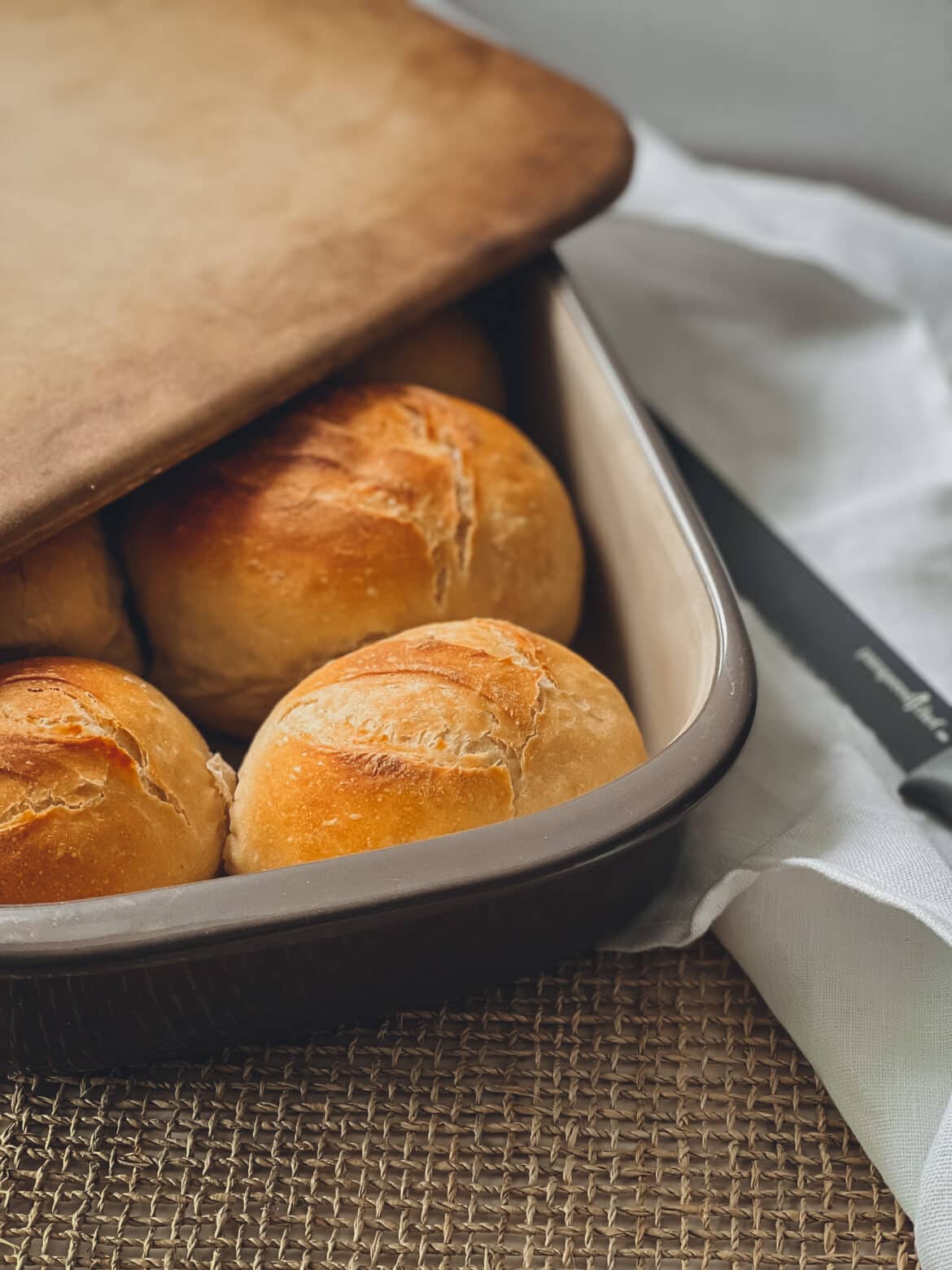 - Das Grundset in den kalten Backofen stellen. Die Temperatur auf 230°C Ober- und Unterhitze stellen. Die Brötchen 30 Minuten backen.