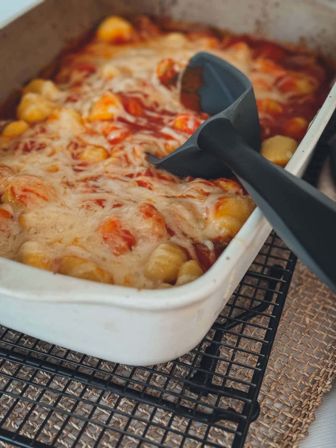 - Die Sauce zusammen mit den Gnocchi in die Auflaufform geben und vermengen. Den Käse mit der groben Reibe reiben und darüber verteilen. Die Temperatur auf 200 °C Ober- und Unterhitze reduzieren und ca. 25 Min. backen.
