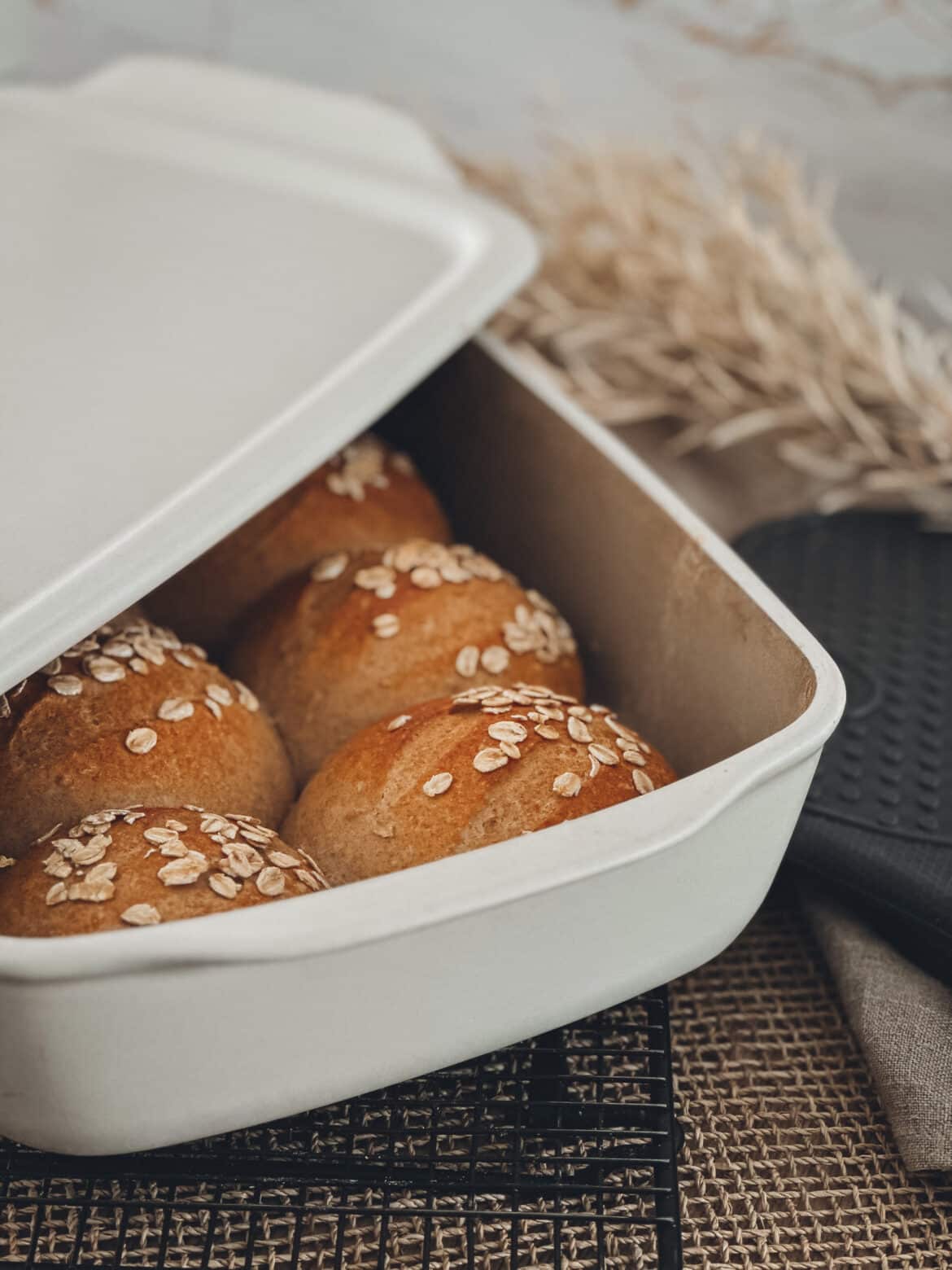 - Die Teiglinge falten und rund schleifen. Zirka 1 cm einschneiden, die Ofenhexe mehlen und die Teiglinge nebeneinander reinsetzen. Die Teiglinge mit Wasser bepinseln und Haferflocken draufstreuen.