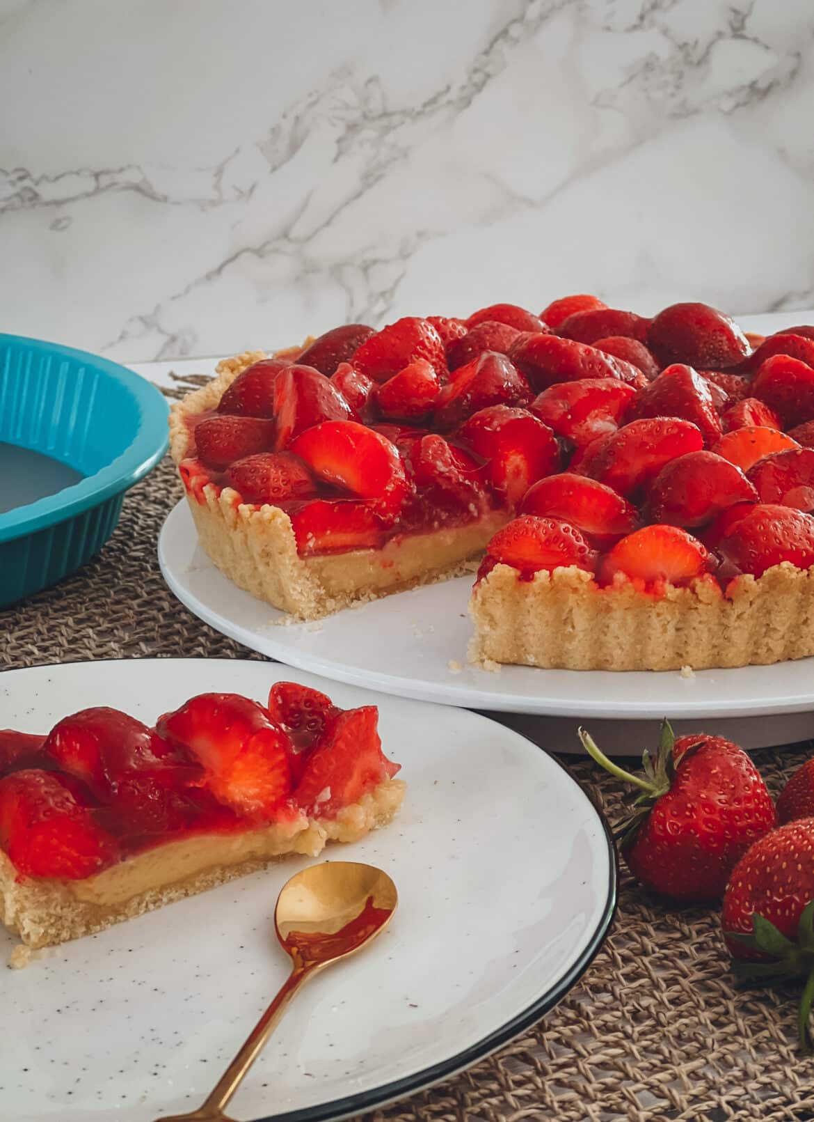 - Die Erdbeeren waschen, putzen und klein schneiden. Auf der Tarte gleichmäßig verteilen.