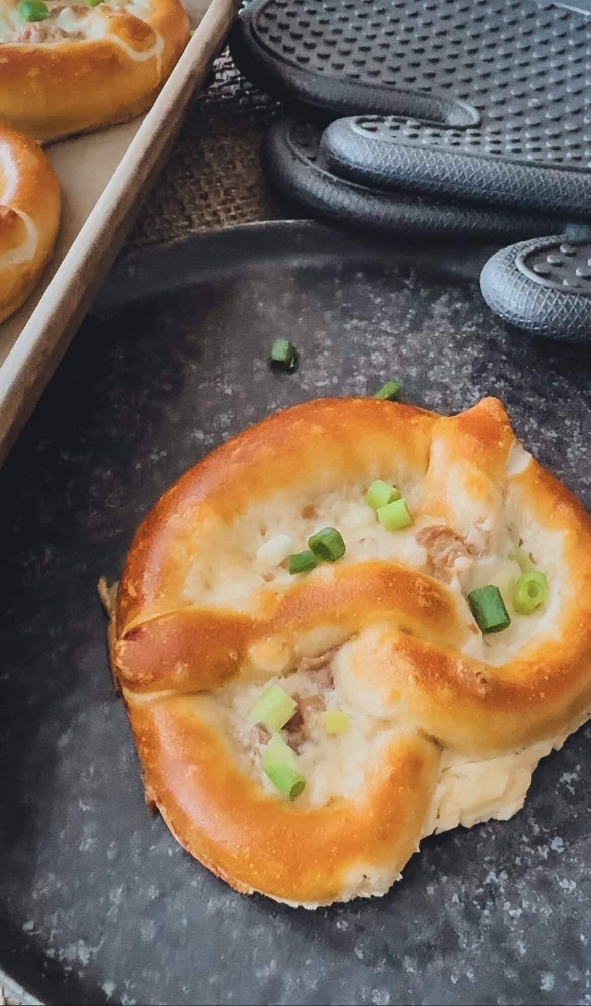 - Die Flammkuchen-Brezen auf der untersten Schiene ca. 20 Minuten backen. Anschließend nochmal 3 Minuten auf 230 Grad hochdrehen und schön braun werden lassen.