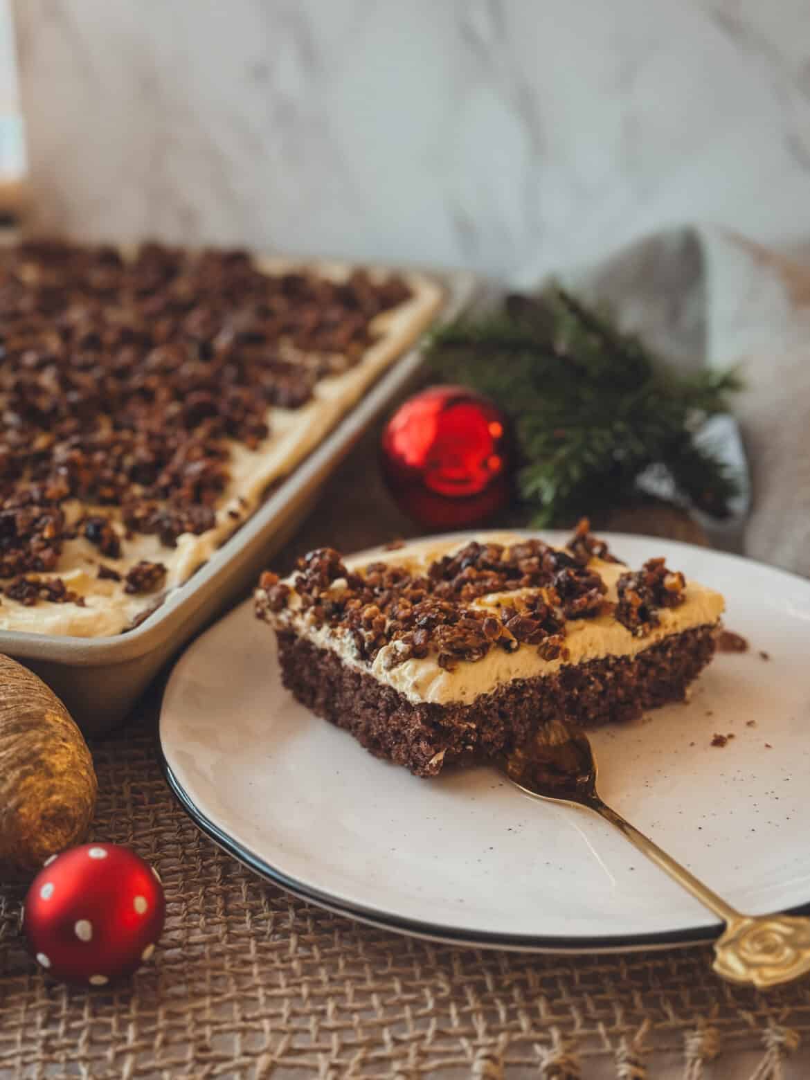 - Die gebrannten Mandeln auseinander bröseln, ggf. mit einem Messer auf dem Kuchen verteilen. Bis zum Verzehr im Kühlschrank lagern.