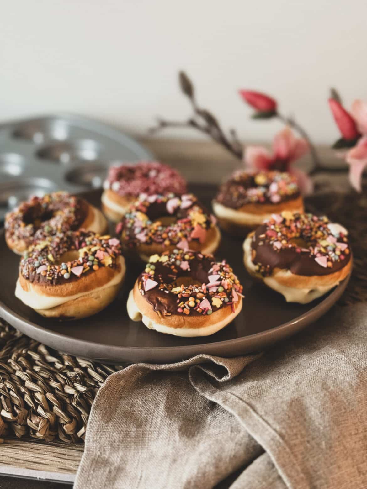 - Die Donutbackform auf mittlerer Schiene in den Backofen geben und die Donuts 12-15 Min. goldbraun backen. Nach dem Backen die Donuts aus der Form nehmen und auf dem Kuchengitter abkühlen lassen.