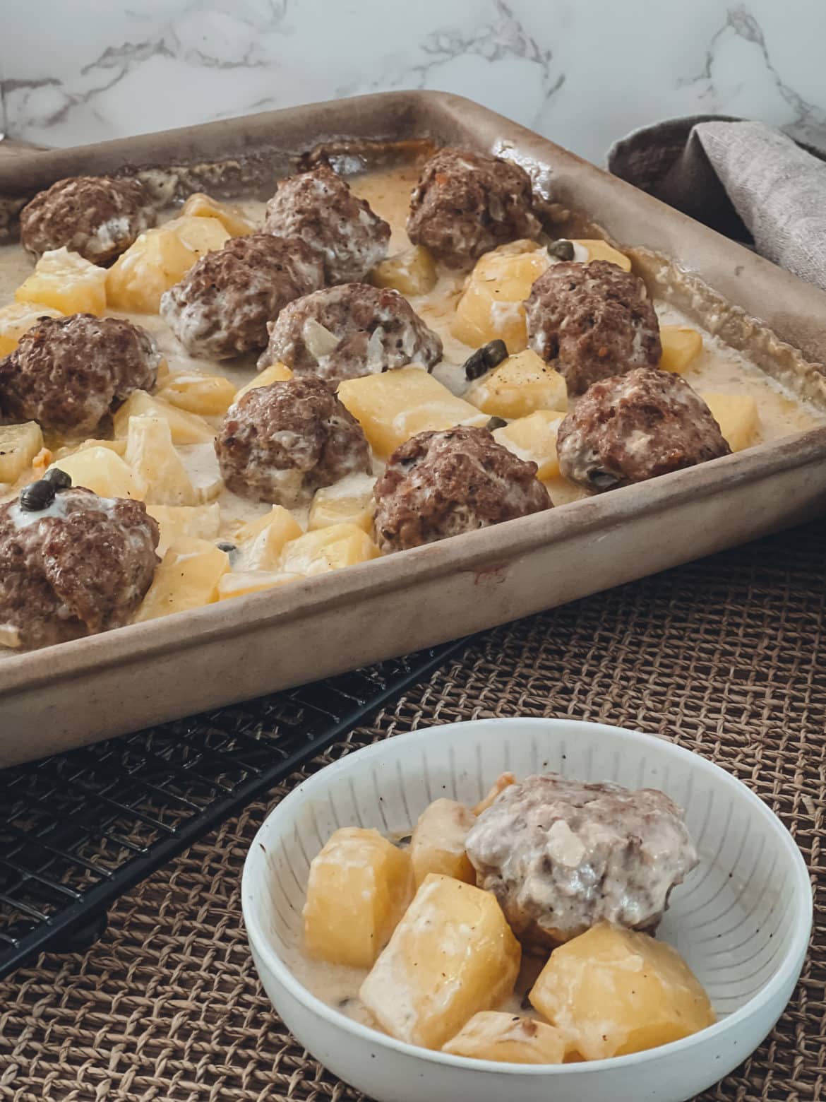 - Für die Sauce heiße Fleischbrühe, Béchamelsauce, restliche Kapern im Messbecher verrühren. Die Sauce gleichmäßig über dem Blech verteilen und 10-15 Minuten fertig garen.