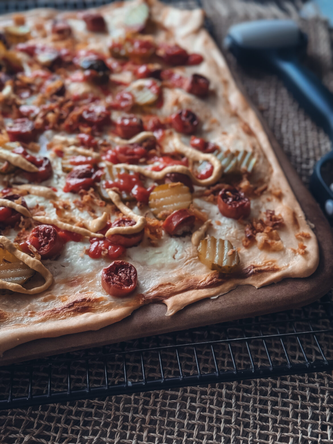 - Den Teig halbieren. Die eine Hälfte auf dem leicht gefetteten Zauberstein mit dem Teigroller ausrollen, mit der Schmandcreme bestreichen, mit Würstchen belegen und im heißen Ofen auf dem Rost auf der untersten Schiene 20-25 Min. backen.