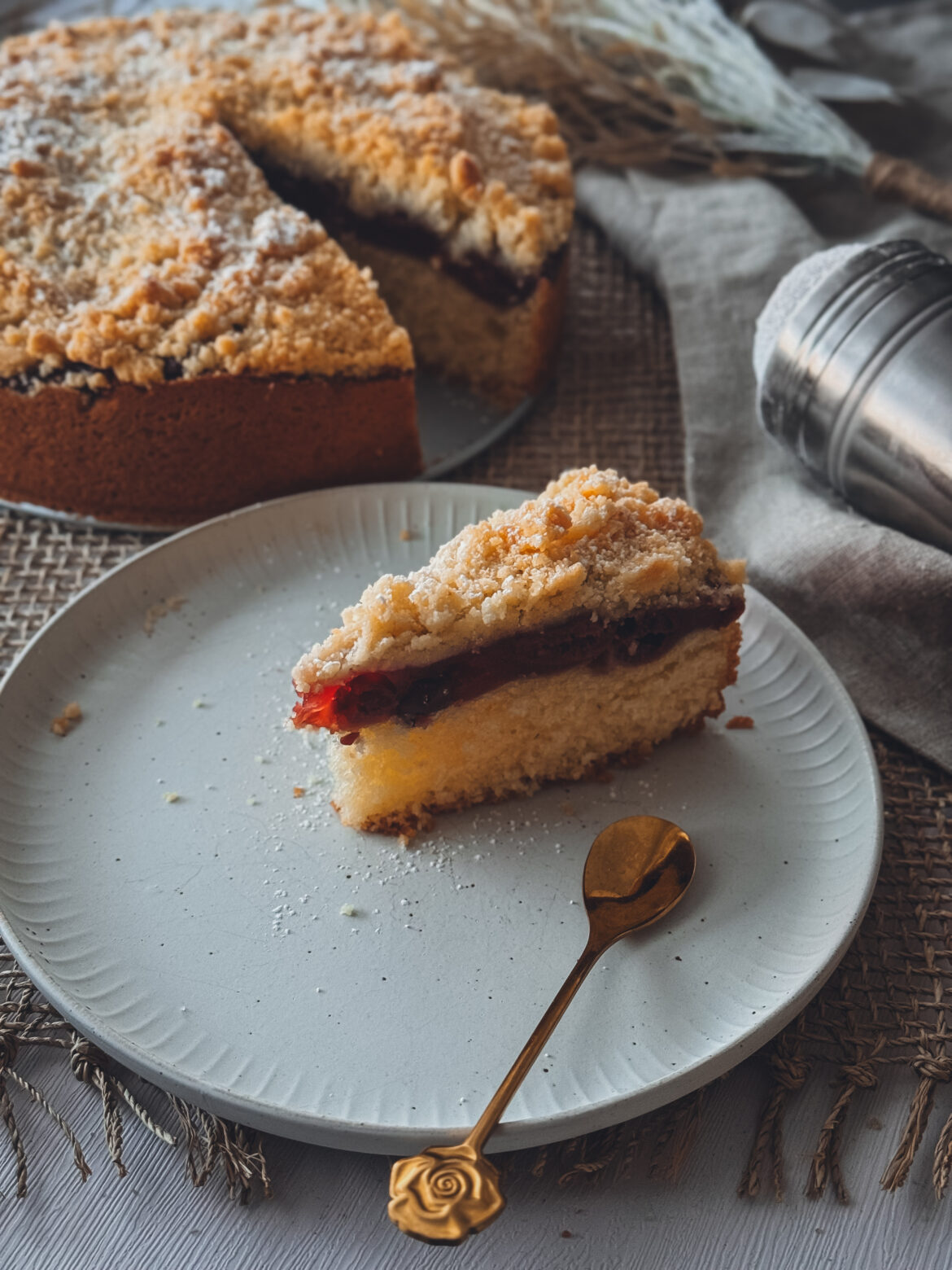 - Streusel aus dem Kühlschrank auf die Kirschen geben.