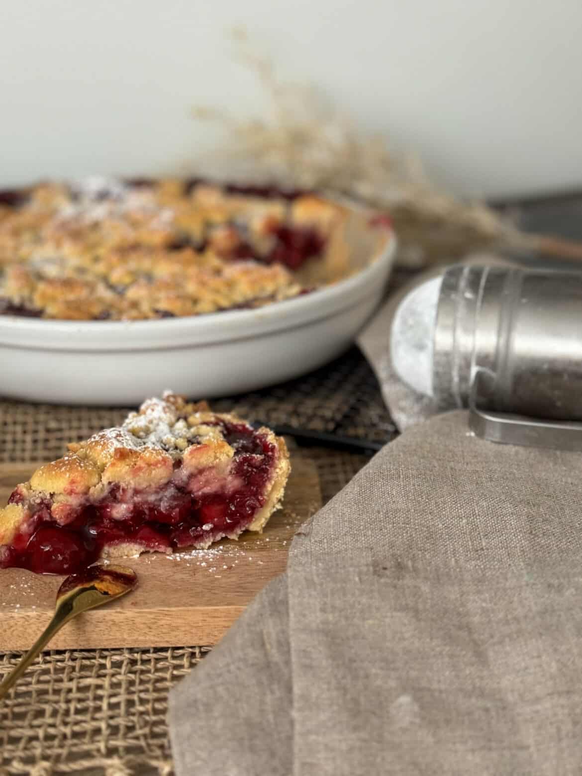 - Die Kirschen unterheben und auf den Boden geben. Die Streusel auf den Kirschen gleichmäßig verteilen.