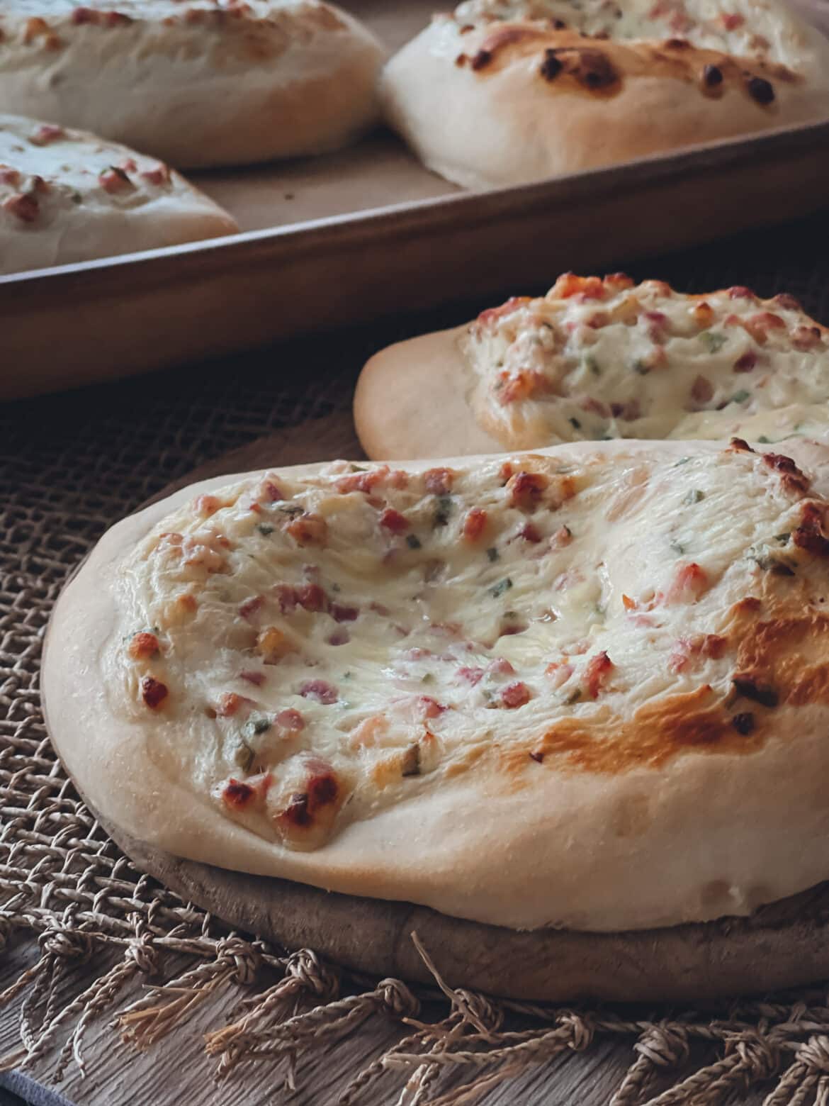 - Die Teigstücke auf die Stoneware setzen und mit dem Teigroller zu flachen Fladen rollen. Dabei mit der schmalen Rolle eine Vertiefung formen, sodass ein kleiner Rand entsteht.