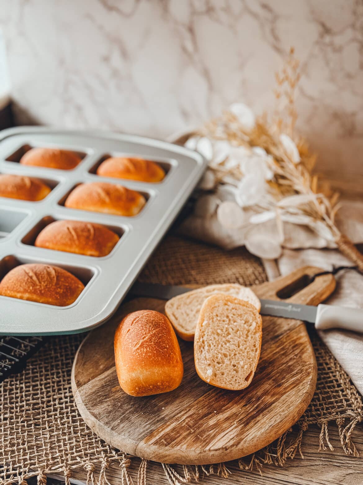 - Die Brötchen aus den Mulden lösen und auf dem Kuchengitter abkühlen lassen.
