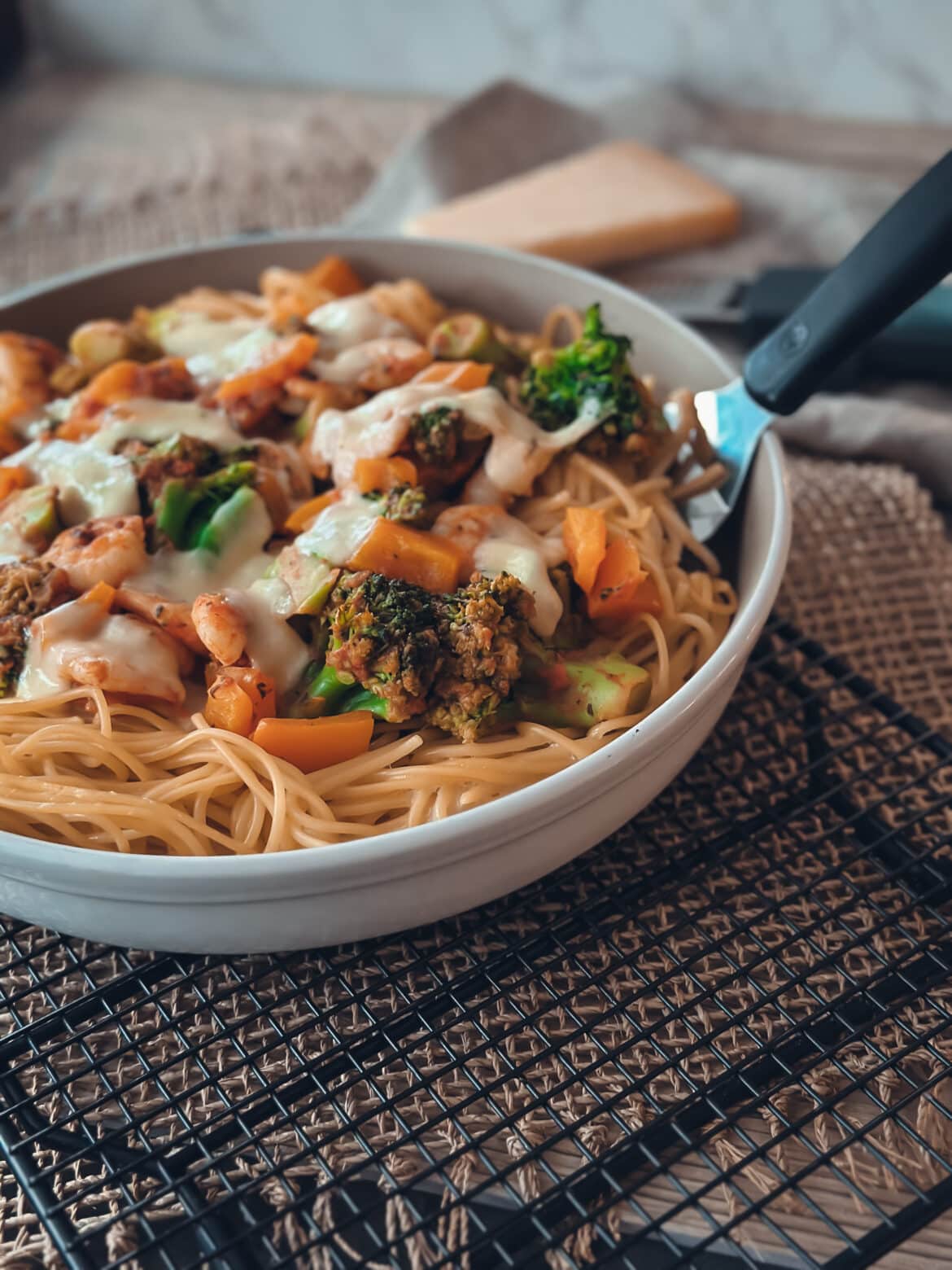 - Das Topping in der Mulde der Spaghetti verteilen.