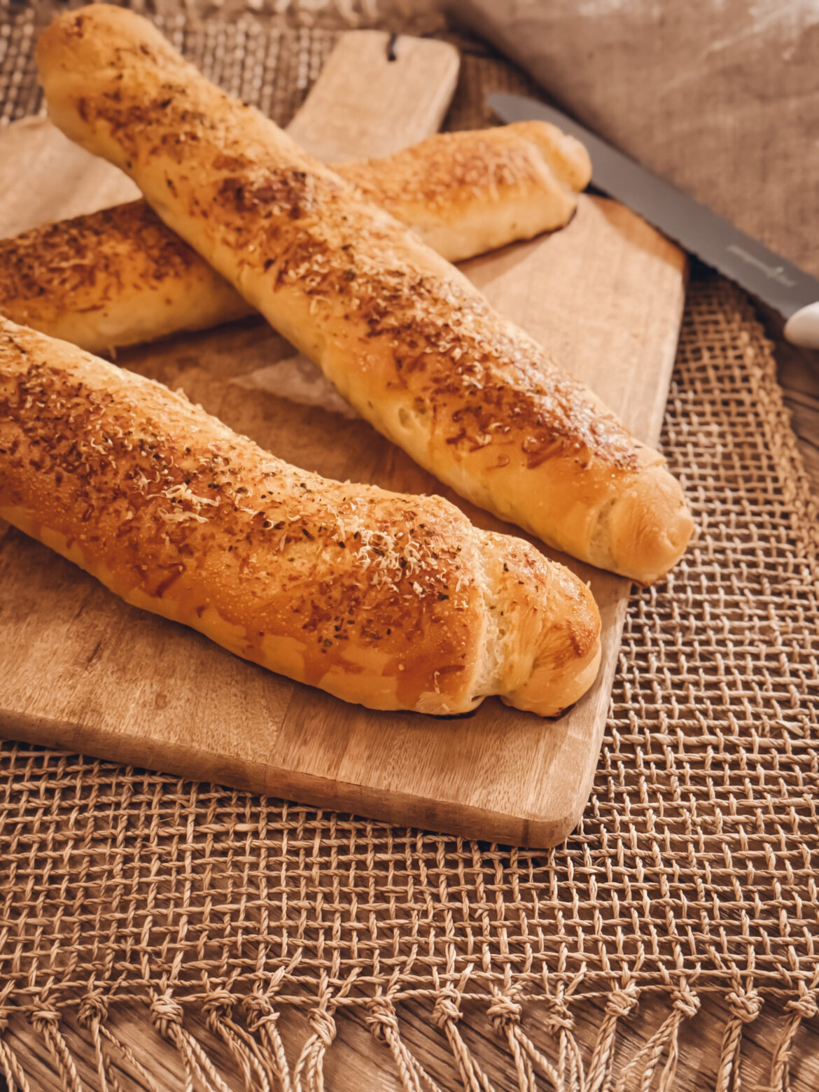 - Bestreiche deine Baguette mit der Ei-/Milchmischung und bestreue es mit der Parmesan-Oregano-Mischung (du kannst sie auch Natur belassen).