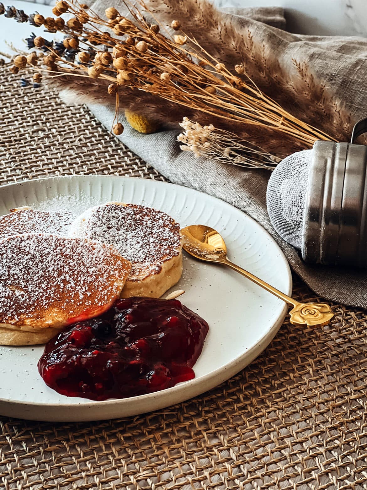 MinutenLuftig lockere Poffertjes goldbraun ausgebacken, dazu fruchtige Rote Grütze oder Vanillesoße.