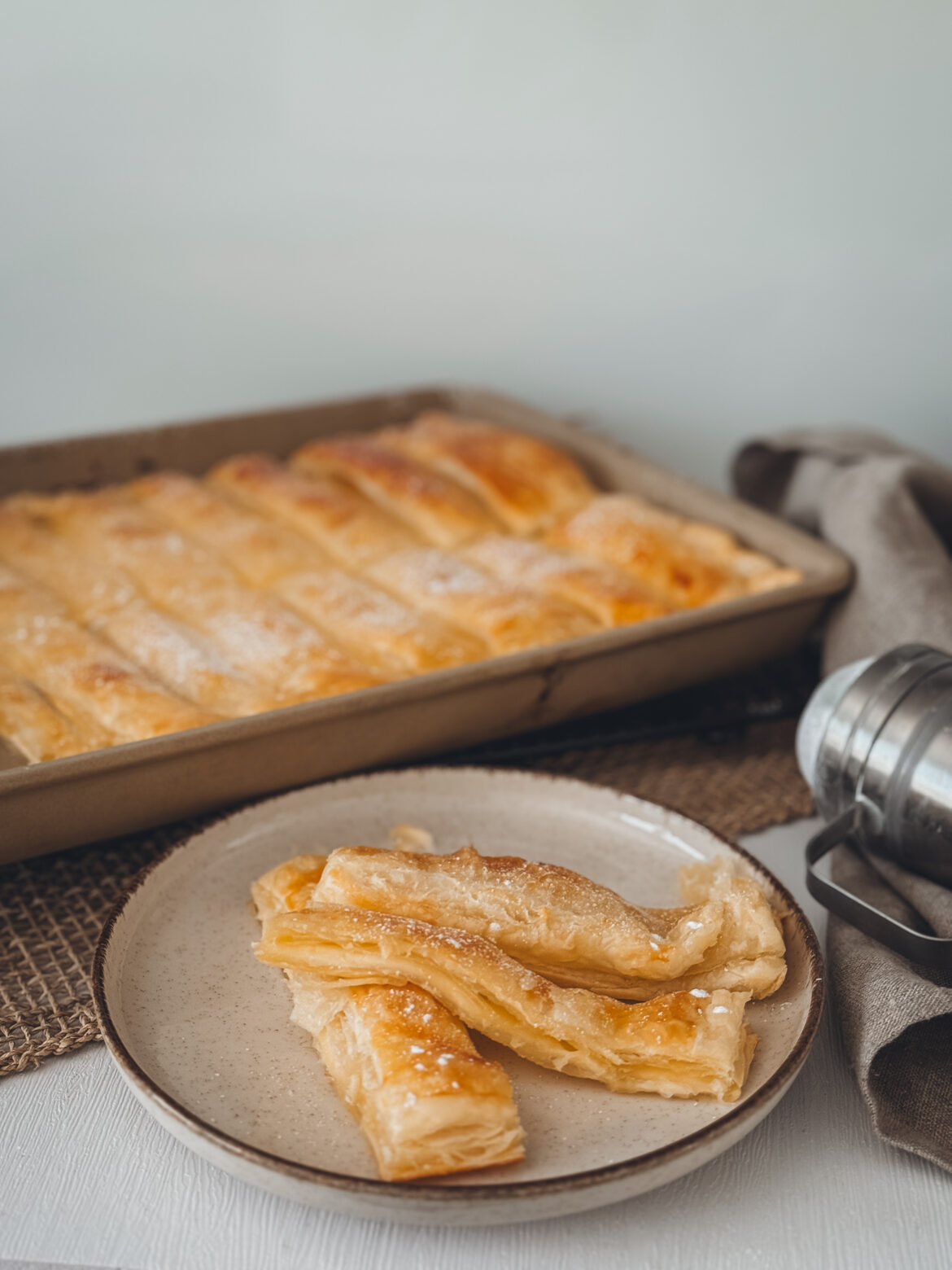 - Blätterteig ohne Backpapier auf dem großen Ofenzauberer ausrollen. Mit der Quarkcreme bestreichen. Den zweiten Blätterteig ohne Papier auf die Creme legen.