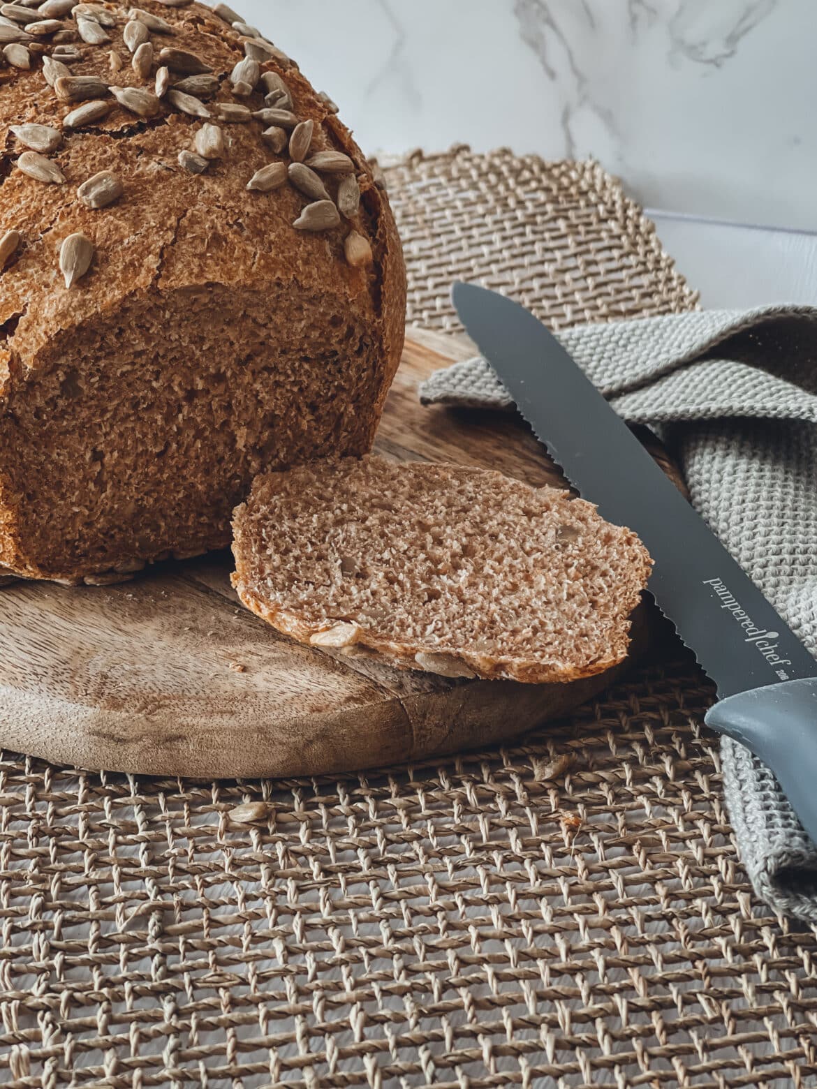 einritzen. Mit Wasser befeuchten und die restlichen Sonnenblumenkerne auf dem Teigling verteilen und festdrücken. - Deckel auflegen und in den kalten Ofen stellen. Auf der untersten Schiene bei 230°C Ober- und Unterhitze 55 Minuten backen.