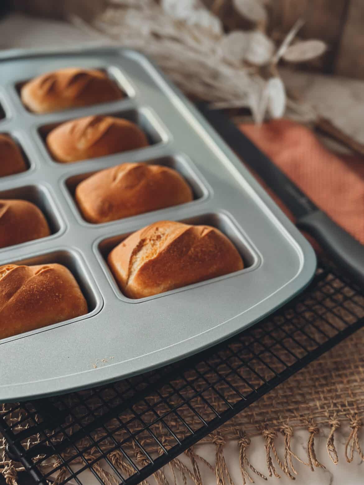 auf 230 Grad Ober-/Unterhitze vorheizen. - Die Brötchen auf dem Rost, mittlere Schiene 20 Minuten backen.