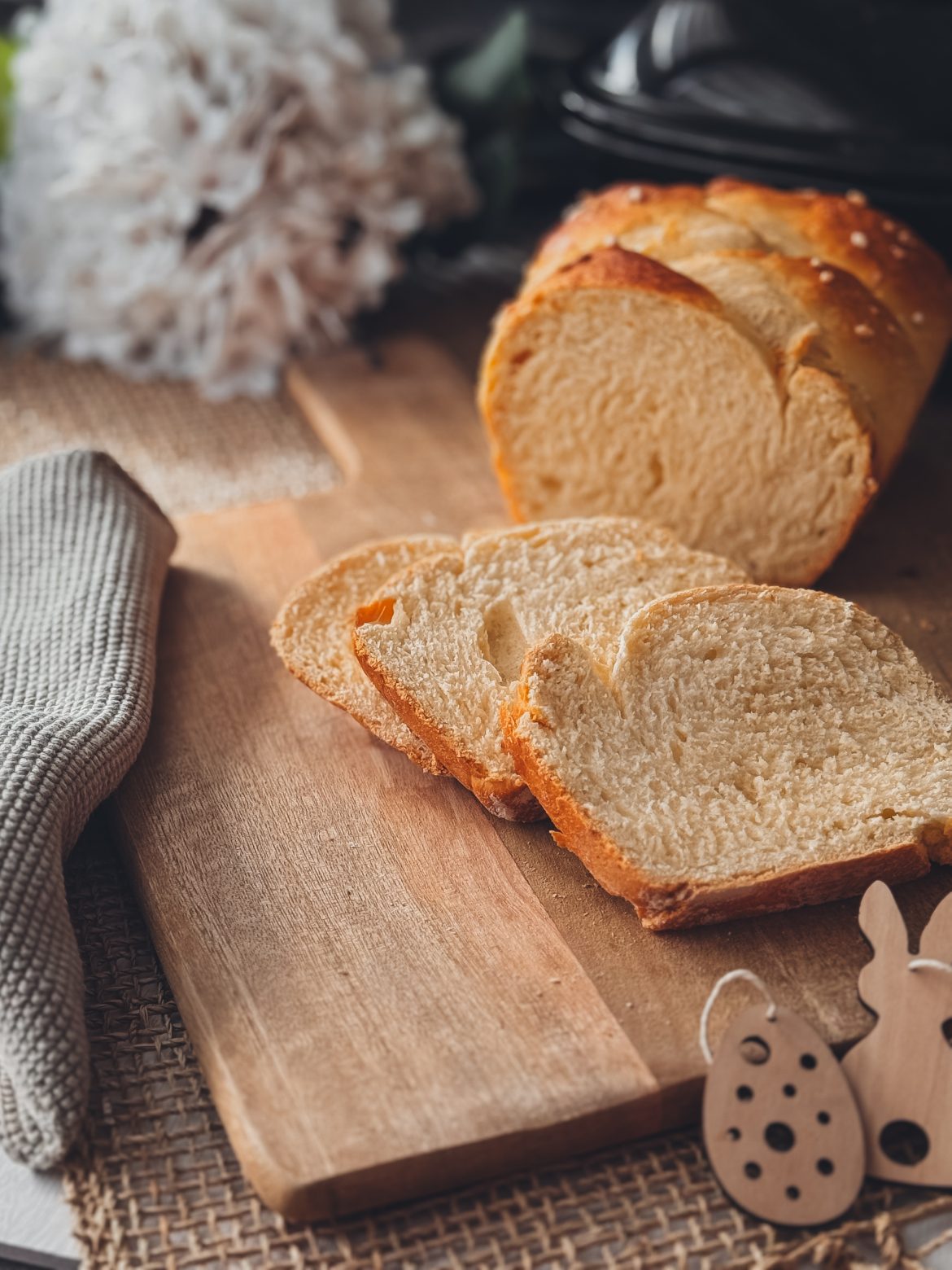 - Den Teig auf die bemehlte Teigunterlage geben, in 3 Portionen teilen und 3 gleich lange Teigstränge formen. Das ganze zu einem kurzen Zopf flechten. Diesen in den kleinen Zaubermeister legen.