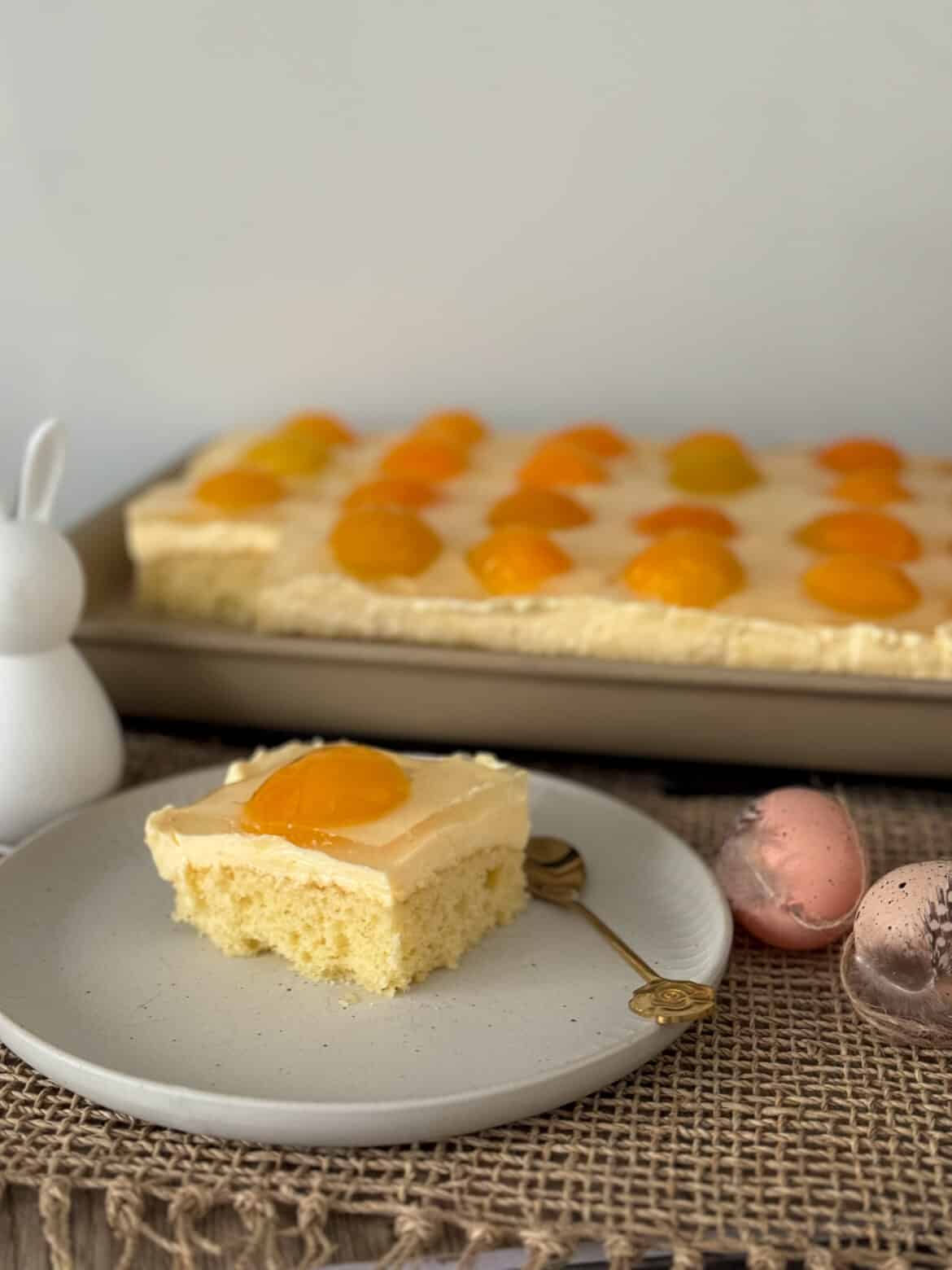 - 500 ml Aprikosensaft abmessen, ggf. mit Wasser auffüllen. Tortenguss nach Packungsanweisung mit Zucker und 500 ml Aprikosensaft/Wasser in einem Topf verrühren und zum Kochen bringen. Fertigen Tortenguss etwas abkühlen lassen und vorsichtig auf die Aprikosen und der Creme verteilen. Kuchen bis zum Servieren kalt stellen.