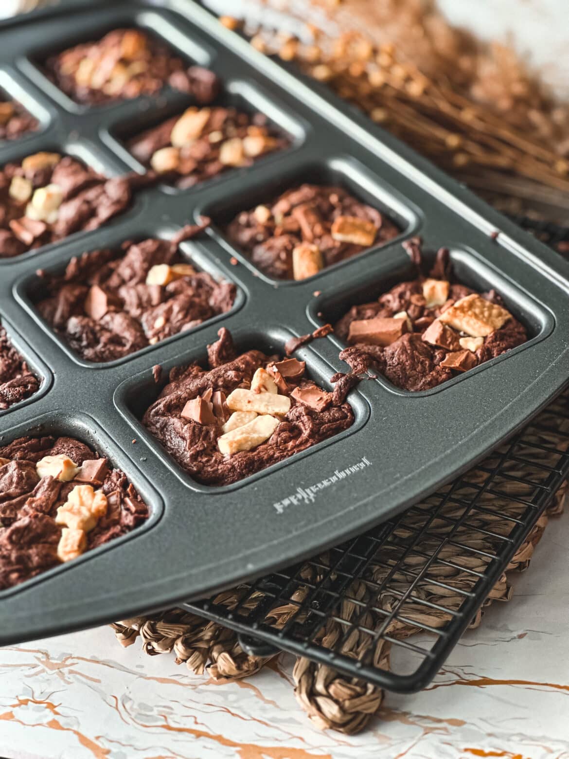 - Den Teig in die einzelnen Mulden füllen. Die restliche gehackte Schokolade auf den Brownies verteilen.