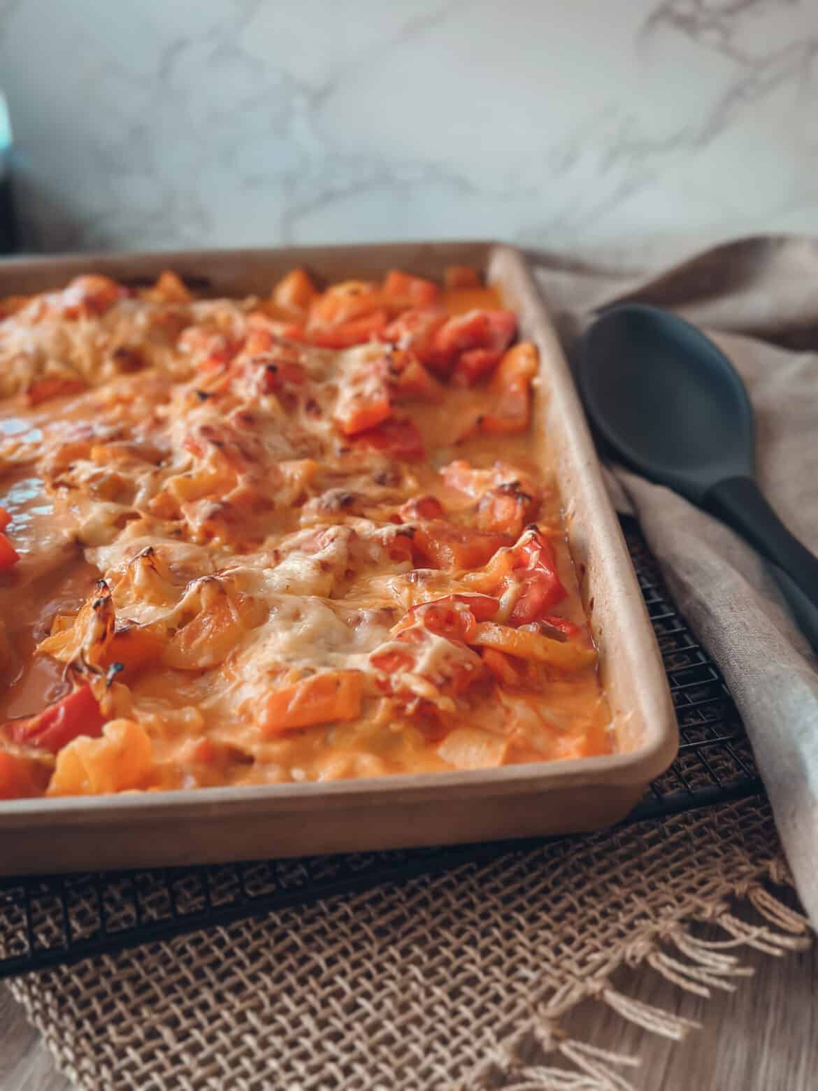 - Paprikasauce mit der Sahne in der großen Nixe verrühren. Paprikawürfel und Zwiebelspalten unterheben. Mit Salz und Pfeffer würzen.