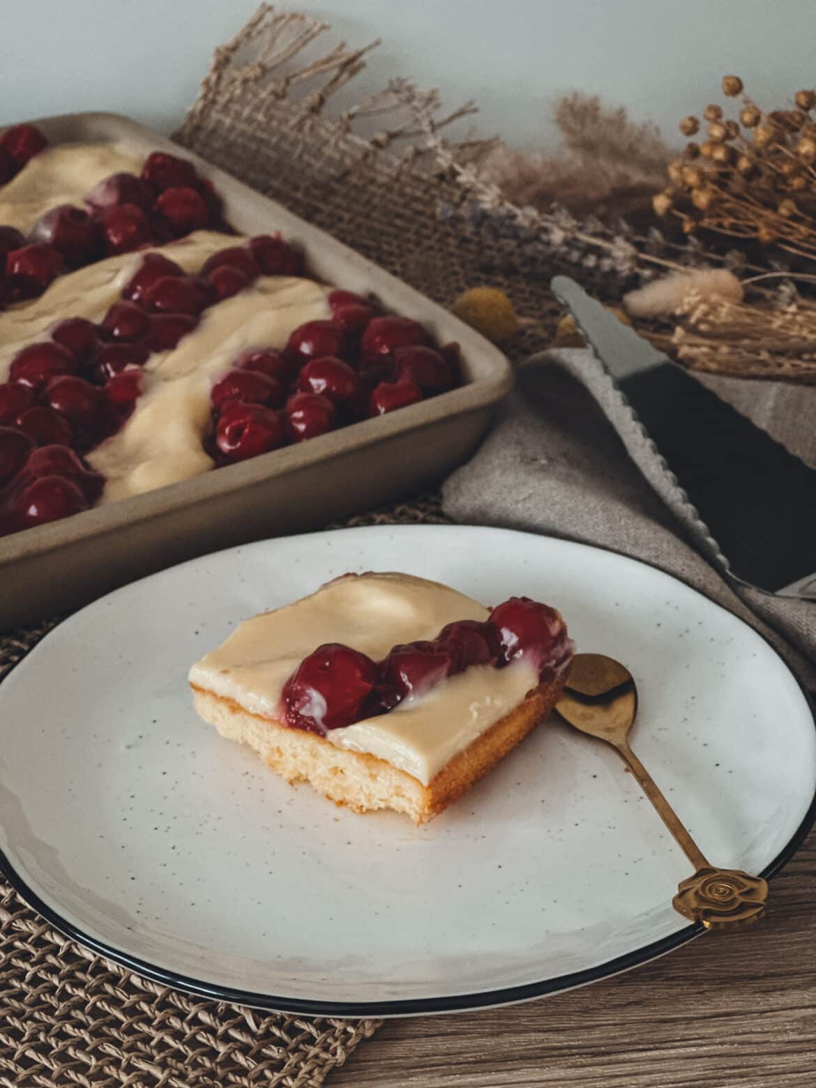 - Kirschen und Pudding noch heiß in diagonalen Streifen auf dem Kuchen verteilen.